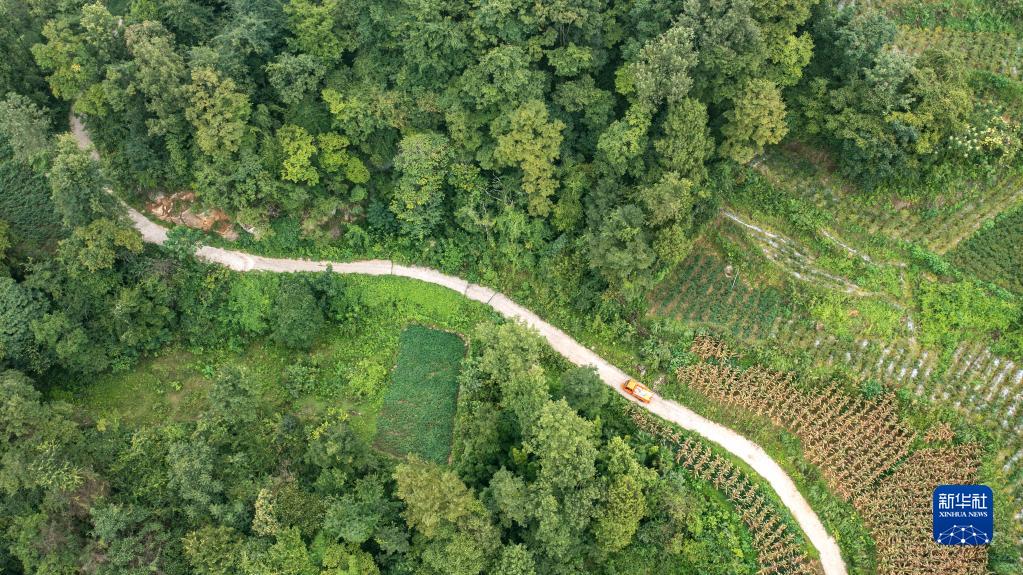 收購(gòu)辣椒的小貨車行駛在貴州省湄潭縣梭塘村的鄉(xiāng)間小路上(8月29日攝,無人機(jī)照片)。新華社記者 陶亮 攝