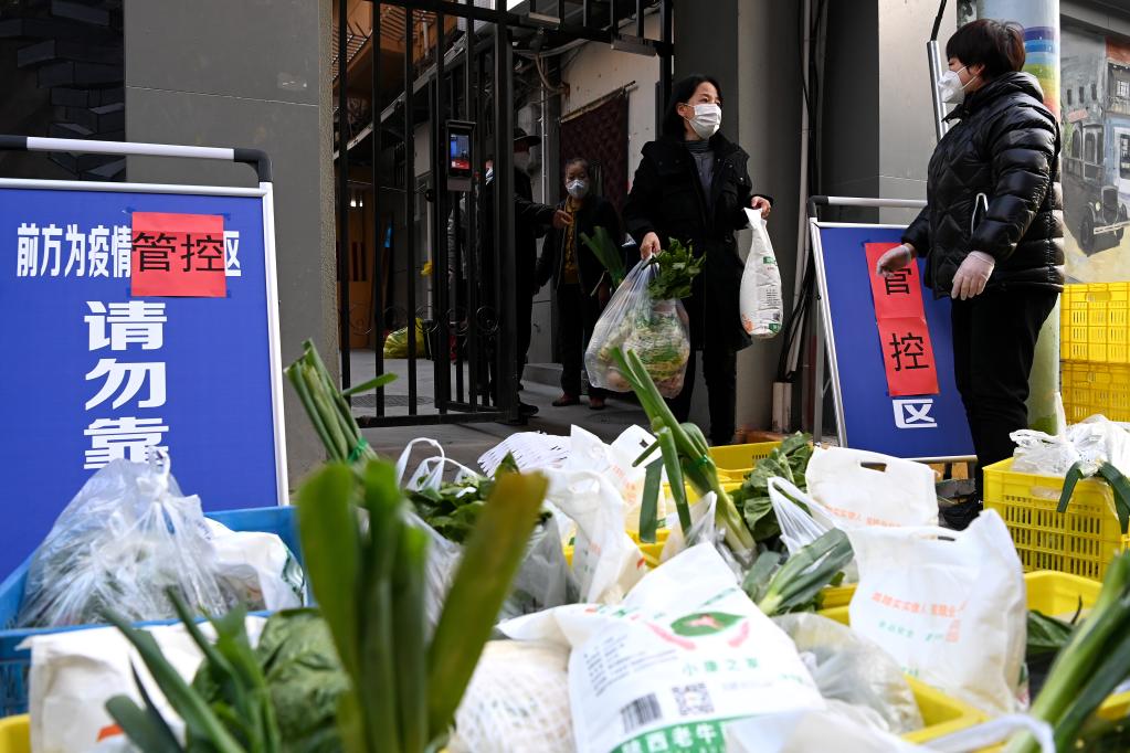 12月29日,在西安市新城區(qū)西一路街道通濟南坊一號院,居民在領(lǐng)取免費生活物資。新華社記者 劉瀟 攝