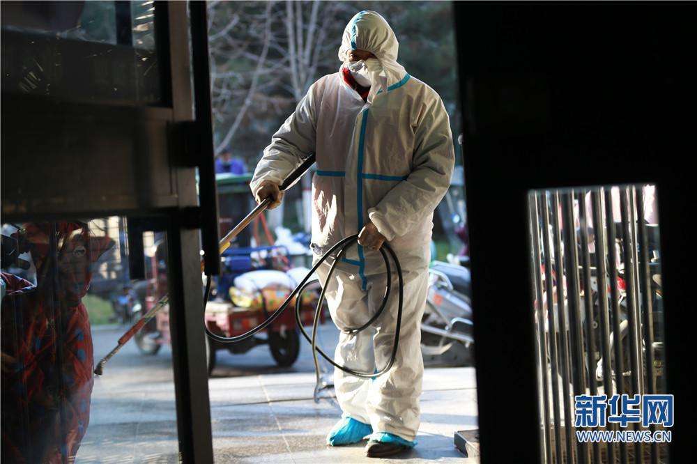 2022年1月1日清晨,西安市浐灞生態(tài)區(qū)一小區(qū)內(nèi),工作人員正在為小區(qū)內(nèi)樓道進(jìn)行消殺。新華網(wǎng) 王智超攝