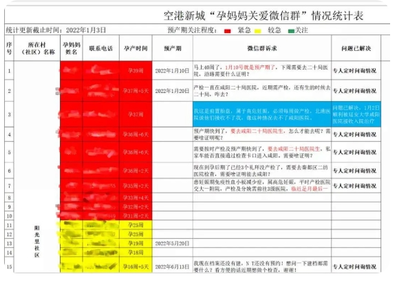 “人命關(guān)天,要趕緊把孕婦的底數(shù)摸清,她們住哪里、電話多少,同時也要想辦法把現(xiàn)有的醫(yī)生和孕婦‘連起來’,把專業(yè)的事情交給專業(yè)的人來解決。”據(jù)空港新城黨委組織部部長葛峰介紹,2021年12月31日早上,在了解到陽光里社區(qū)有孕婦需要去醫(yī)院進行檢查和分娩的需求后,當天下午4點多,社區(qū)黨支部書記殷振建就迅速將22名孕婦的相關(guān)情況及時上報給組織部,并由專人對群里孕媽媽們的訴求進行實時統(tǒng)計。