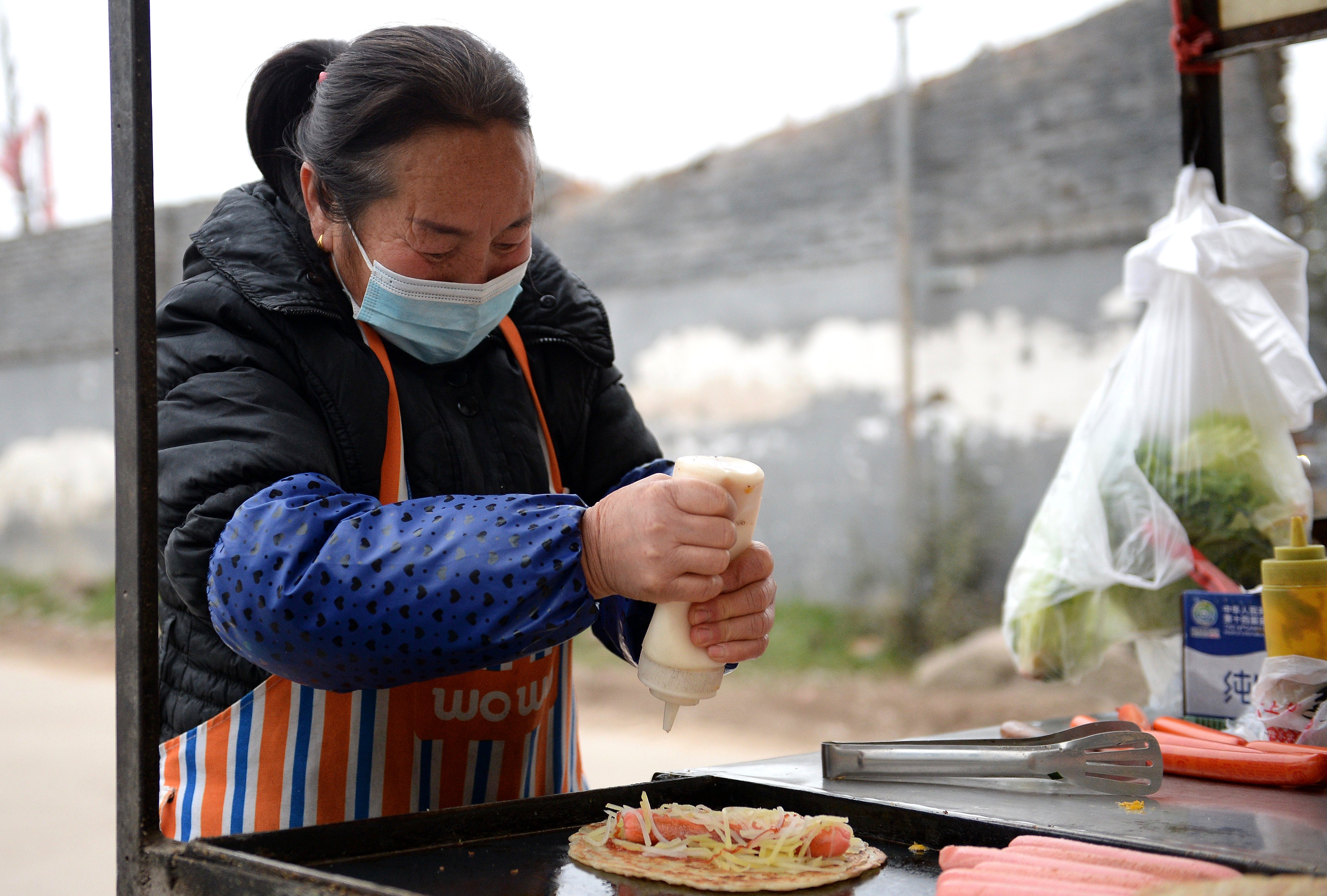 “多一點沙拉醬!”“好嘞!”攤餅、切烤腸、加土豆絲、摘青菜、擠沙拉醬……趙軍曉動作嫻熟,不到三分鐘,就把一份新鮮的手抓餅遞給了攤前的顧客。作為西唐寨村的村民,這是西安多日封閉式管理以來,她第一天外出擺攤。“有點興奮,通知五點可以出來,我四點就把東西準備好了!”雖然戴著口罩,她仍是笑意難掩。