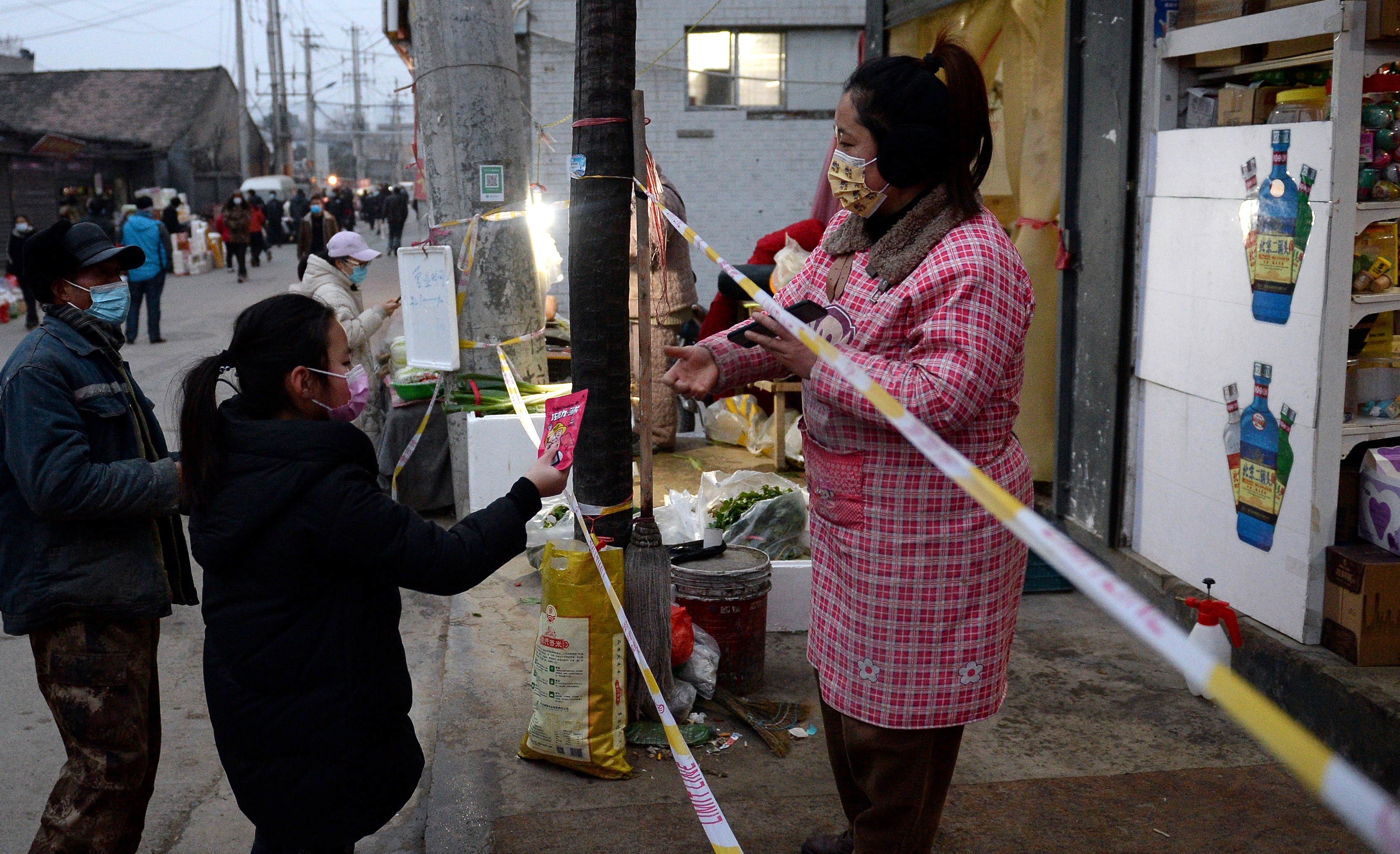 在趙軍曉的對面是一家饅頭店,三列銀白色的不銹鋼蒸籠堆得比人高,不時“噗噗”地冒著熱氣。上層的饅頭色白、圓潤而飽滿,不斷被店主一齊摟進袋子,遞給警戒線外的排隊購買的三五村民。“他們家的饅頭好吃!”村民薛東紅剛采購了兩個白蘿卜、三顆大白菜,打算再買幾袋饅頭就回家,“我家還有十多個房客,多買點也能給大家分一分。”她說。
