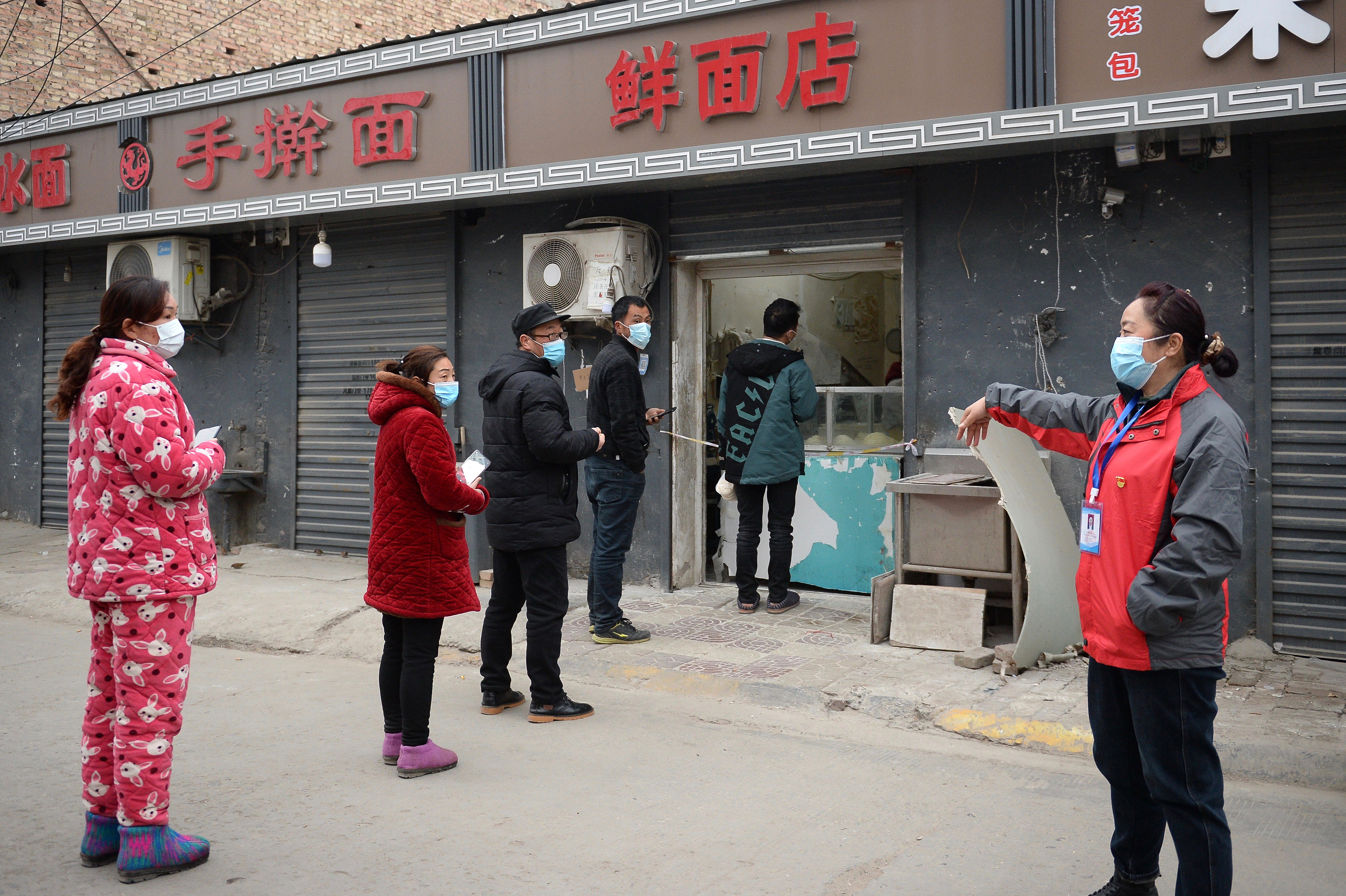 西安市未央?yún)^(qū)未央街道西唐寨村的志愿者在維持村民購物秩序(1月7日攝)。