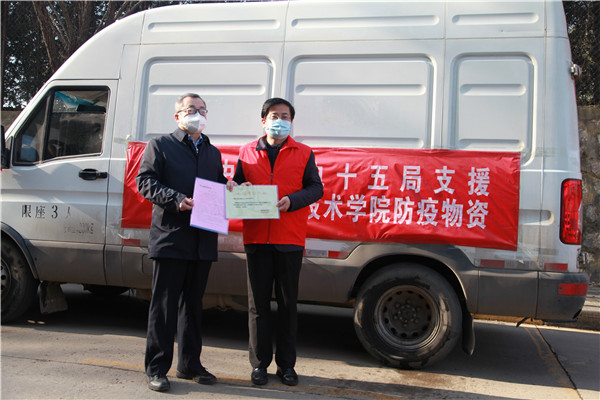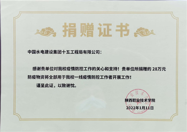 1月11日下午15:00,在陜西職業(yè)技術(shù)學(xué)院舉行簡短捐贈儀式,陜西職業(yè)技術(shù)學(xué)院黨委副書記、院長劉勝輝,黨委副書記、紀委書記何軍,副院長王慶等參加了捐贈儀式。劉勝輝代表學(xué)院黨委向我公司表示感謝,他表示,在疫情防控的關(guān)鍵時刻,水電十五局一周內(nèi)2批次送來價值近28萬元生活物資,及時緩解更極大充實和豐富了我??挂呱钗镔Y,為我院師生樹立了光輝榜樣,堅定了共克時艱的信心和決心。何軍向公司黨委副書記、紀委書記、工會主席任志宏贈送了捐款證明和感謝信。任志宏表示,水電十五局作為駐陜央企,一直以來,堅決貫徹落實黨中央決策部署,主動響應(yīng)陜西省委組織部和省國資委號召,面對此次疫情,將積極踐行央企擔(dān)當(dāng),履行社會責(zé)任,用實際行動為西安高校疫情防控貢獻一份力量!