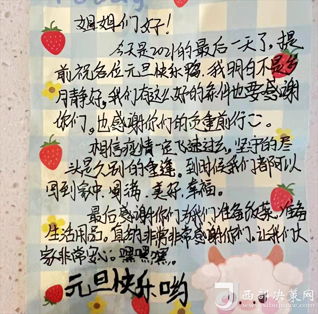 12月31日晚,即將迎來我國傳統(tǒng)佳節(jié)元旦。隔離學(xué)生怡忻悅通過手機(jī)向田甜發(fā)來了一張留言卡片,“姐姐好!今天是2021年的最后一天了,提前祝大家元旦快樂。我明白不是歲月靜好,我們有這么好的條件要感謝你們,感謝你們的負(fù)重前行。相信疫情一定飛速過去,堅(jiān)守的盡頭是久別的重逢,到時(shí)候我們都可以回到家中,圓滿、美好、幸福。最后感謝你們?yōu)槲覀儨?zhǔn)備飯菜,準(zhǔn)備生活用品,讓我們大家非常安心。”學(xué)生們一句句發(fā)自肺腑、情真意切的心里話在這數(shù)九寒天里溫暖和鼓舞著每一名后勤保障人員,讓大家的疲憊一掃而空,渾身充滿了干勁和戰(zhàn)勝疫情的巨大信心。