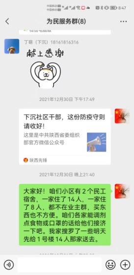 看著手里拎的幾顆白菜、蘿卜、西紅柿,我感到慚愧難當(dāng),作為一名黨員、一名下沉干部,實(shí)在是失職,沒有履行好“民之所憂,我必念之;民之所盼,我必行之”的使命擔(dān)當(dāng)。投送完愛心菜到家后,我立即在群里倡議小區(qū)下沉干部對(duì)1-3-2302的務(wù)工人員開展愛心救助活動(dòng),并從自家的抗疫儲(chǔ)備物資里勻出了2袋子蔬菜、豆腐乳、魚醬罐頭、口罩、水果等物資,并附上了溫馨小紙條,寫上我的聯(lián)系電話,鼓勵(lì)他們堅(jiān)定克服困難的信心和決心。第二天,社區(qū)領(lǐng)導(dǎo)、小區(qū)鄰居們得知情況后,紛紛伸出援助之手,不到半小時(shí),鍋灶有了、菜刀案板有了、糧食蔬菜也都有了…,社區(qū)的慰問品也送來了。大伙不僅給他們送去了物資,更送去了關(guān)心和安慰,他們的生活起居也迅速融入了小區(qū)大家庭,業(yè)主群里每天都有人對(duì)他們噓寒問暖,他們也經(jīng)常在業(yè)主群曬他們做的川味美食。他們私下跟我說,這幾年,他們?cè)诤薄⑿陆鹊囟加龅竭^疫情,但最讓他們感動(dòng)的還是西安,黨和政府的細(xì)致安排、西安人民的熱情相助,讓他們?cè)谒l(xiāng)異地孤立無援時(shí),第一次感到不慌了。