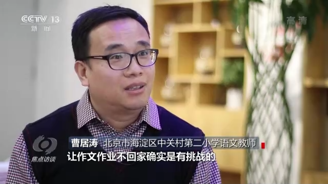 北京市海淀區(qū)中關(guān)村第二小學(xué)語文教師曹居濤說:“比如說高年級的作文,讓作文作業(yè)不回家確實(shí)是有挑戰(zhàn)的,所以我們就對教與學(xué)的方式進(jìn)行了大膽的嘗試和改變。從習(xí)作布置的時(shí)間上進(jìn)行了改變,叫任務(wù)前置。孩子學(xué)習(xí)單元之初,要了解這一單元當(dāng)中的習(xí)作主題是什么,讓孩子的習(xí)作和生活建立聯(lián)系。”