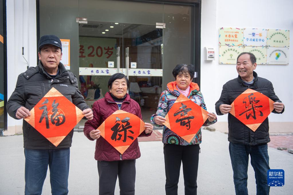 1月18日,江北區(qū)桃源小區(qū)的居民拿著寫(xiě)好的字在“長(zhǎng)者之家”門(mén)口合影。該小區(qū)老年人居住比例較高,在老舊小區(qū)改造過(guò)程中,街道將小區(qū)內(nèi)閑置用房改造成集老年大學(xué)、幼兒托管等為一體的“長(zhǎng)者之家”。新華社記者 江漢 攝