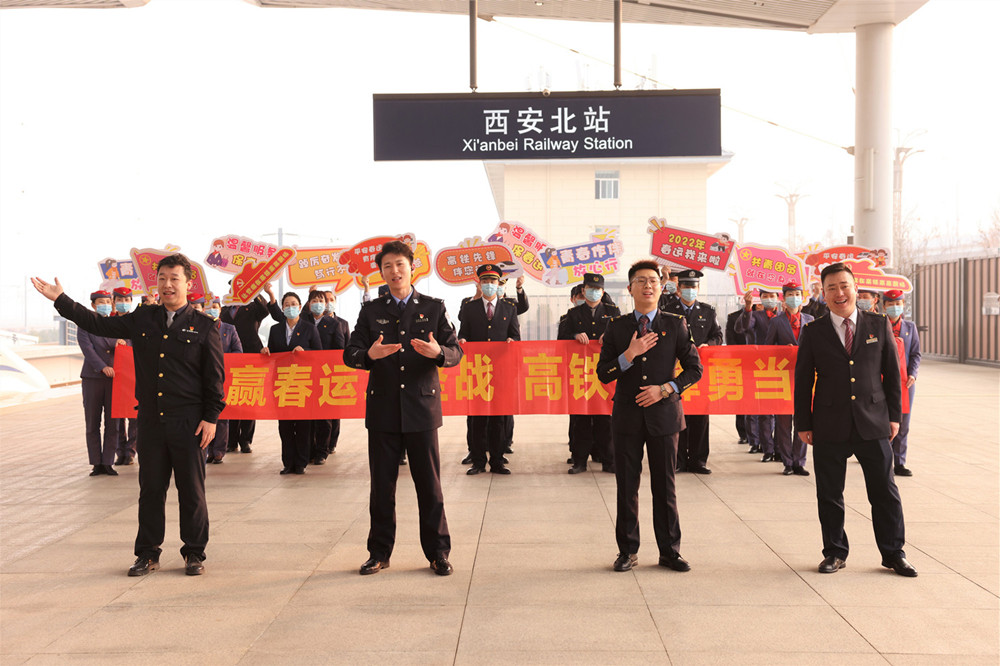 1月17日,來自中國(guó)鐵路西安局集團(tuán)有限公司黨團(tuán)員代表,在西安北站演唱西鐵版《西安人的歌》。