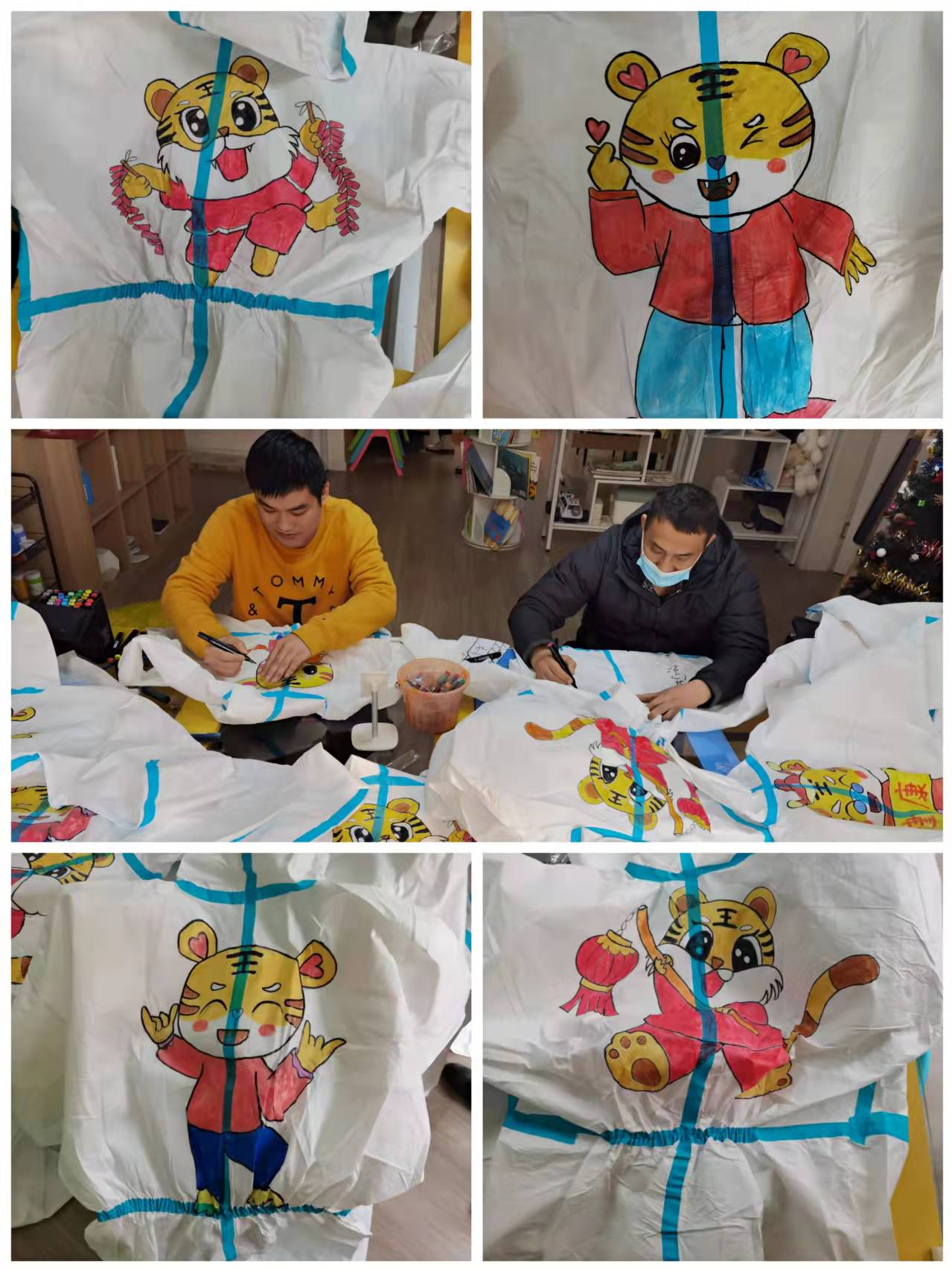 憨態(tài)可掬的小老虎,有的瞇縫著眼睛,有的張開嘴巴,有的捧著鞭炮,有的打著燈籠,還有的雙手捧“福”到家……這些五彩繽紛的圖案,出現(xiàn)在雁塔區(qū)杜城街道中鐵尚都城社區(qū)一批志愿者的防護(hù)服上,引人注目。