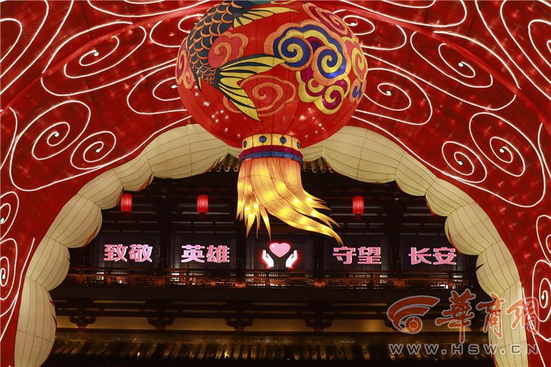 在雁南一路口設(shè)置了“致敬英雄 守望長安”燈組。宋立嬌介紹,設(shè)計(jì)這組燈是為了向抗疫英雄致敬,并鼓舞全市人民抗疫士氣。雁南一路以南水池上“百鳥朝鳳”燈組,以鳳凰、牡丹、百鳥為主題,打造百鳥朝鳳氛圍裝置,體現(xiàn)出一切生機(jī)勃勃,美好時光來臨,看到了一片美好的前景。