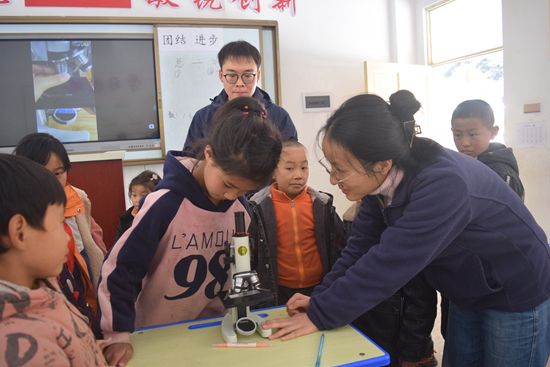 華中農(nóng)業(yè)大學(xué)研支團志愿者教學(xué)生們使用顯微鏡。