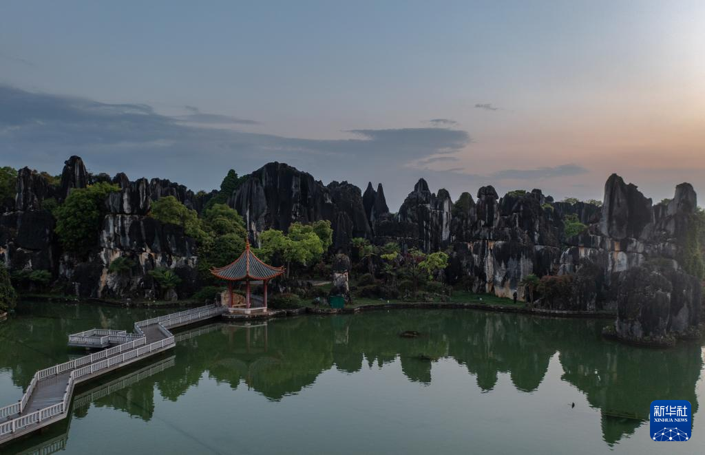 這是4月9日拍攝的石林日落景觀(無(wú)人機(jī)照片)。新華社記者 曹夢(mèng)瑤 攝