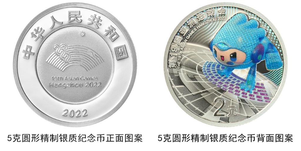 5克圓形銀質(zhì)紀(jì)念幣背面圖案為第19屆亞洲運(yùn)動(dòng)會(huì)吉祥物電子競技運(yùn)動(dòng)造型,輔以互聯(lián)網(wǎng)科技符號、跑道等元素裝飾組合設(shè)計(jì),并刊“第19屆亞洲運(yùn)動(dòng)會(huì)”等字樣。該紀(jì)念幣含純銀5克,最大發(fā)行量10萬枚。