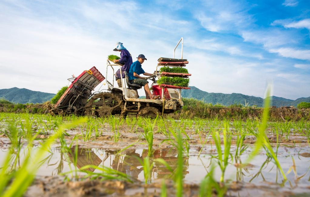 4月12日,江西省九江市都昌縣蔡嶺鎮(zhèn)楊灣村農(nóng)民駕駛農(nóng)機(jī)在田間勞作。新華社發(fā)(傅建斌 攝)