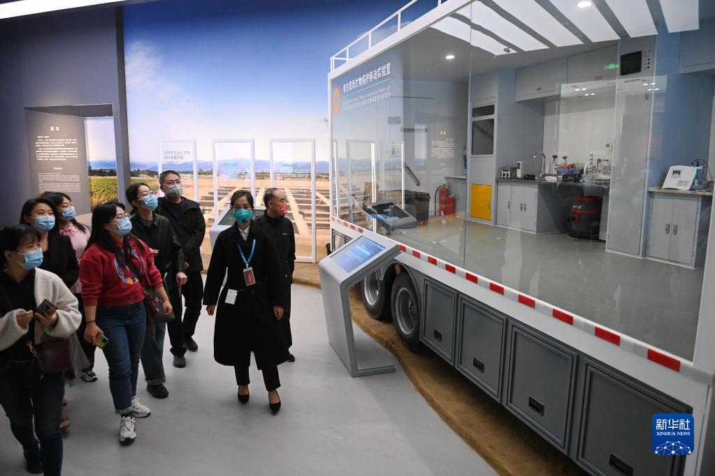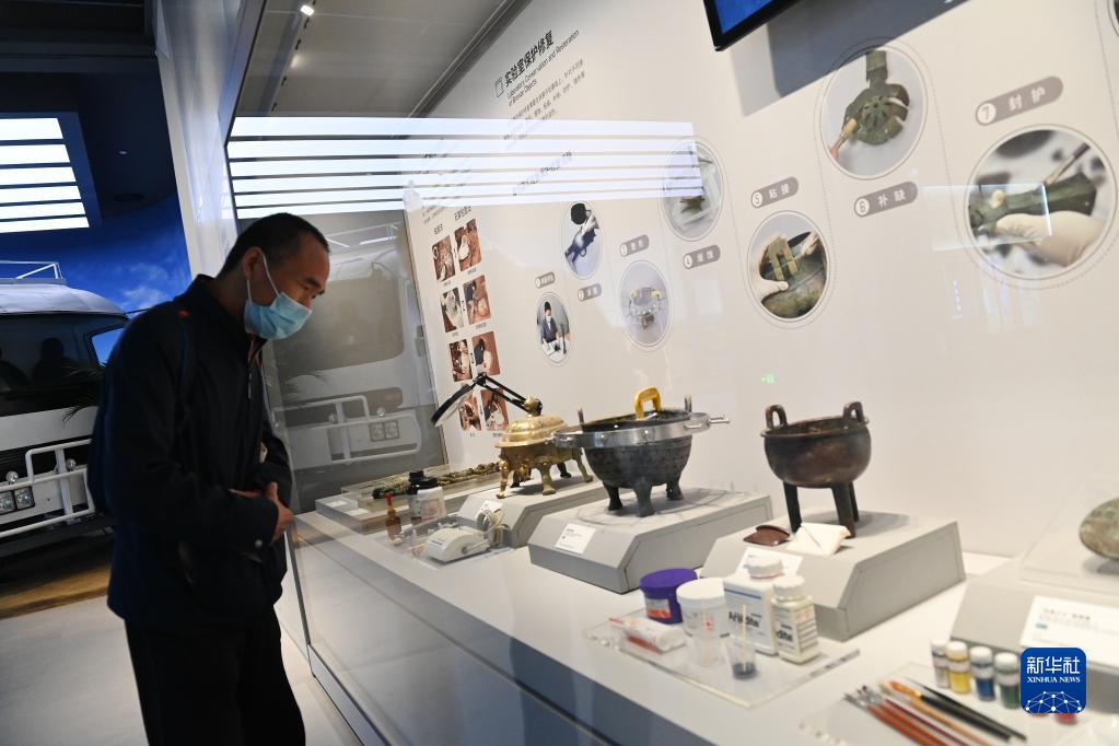 4月28日,游客在陜西考古博物館內(nèi)參觀考古現(xiàn)場文物保護(hù)移動實驗室。新華社記者 李一博 攝