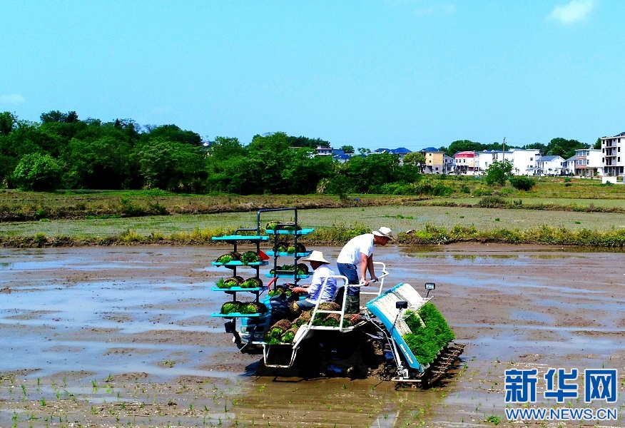 在江西省湖口縣新豐村的連片稻田里,周益和父親周愛霞正駕駛農(nóng)機來回穿梭。新華網(wǎng)發(fā) 徐會剛 攝