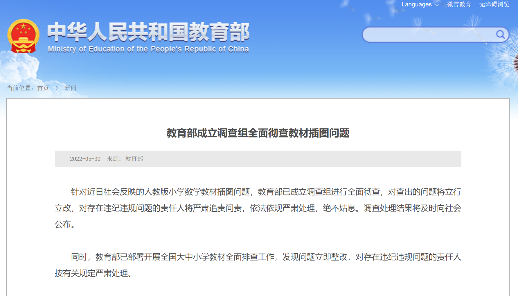 教育部成立調(diào)查組全面徹查教材插圖問題