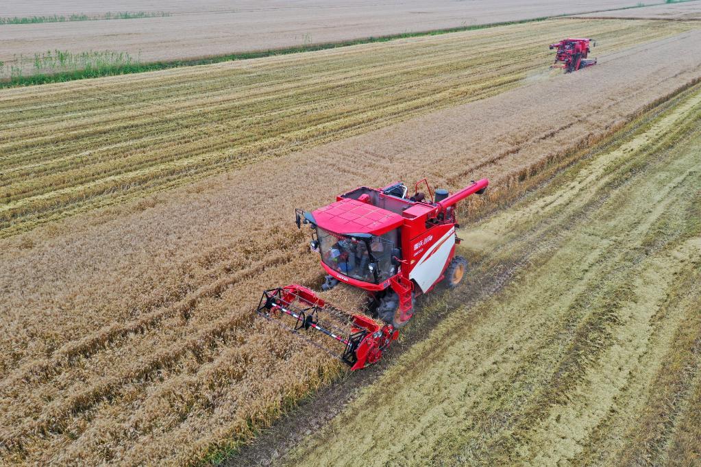 位于安徽省宿松縣的華陽(yáng)河農(nóng)場(chǎng)機(jī)收小麥現(xiàn)場(chǎng)。新華社發(fā) 李龍 攝