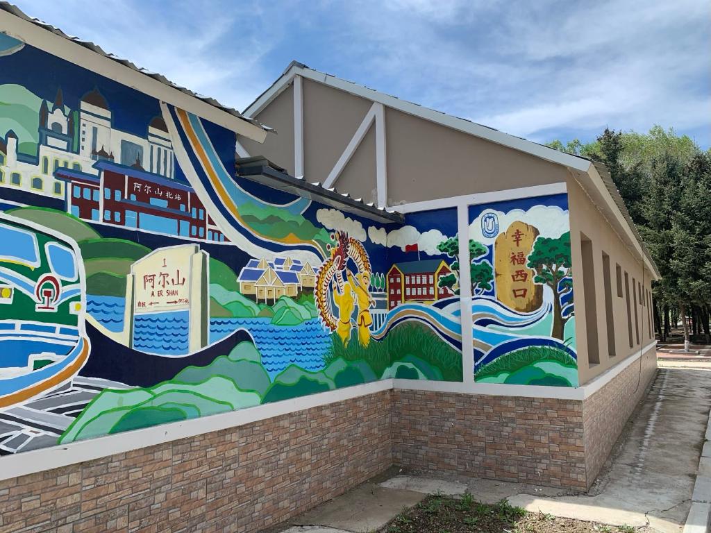 在西口村黨群服務(wù)中心,幾十面墻壁滿是各色墻繪,艷麗而靈動(dòng),灰頭土臉的老房子一下“活”了起來。這些作品都是近幾年創(chuàng)作的。尤其在2021年,西口村舉行了第一屆阿爾山市鄉(xiāng)村墻繪藝術(shù)大賽,上海大學(xué)上海美術(shù)學(xué)院、浙江藝術(shù)職業(yè)學(xué)院、廣州美術(shù)學(xué)院附中等8所院校,近千人次來到西口村,長(zhǎng)達(dá)數(shù)月進(jìn)行墻繪創(chuàng)作,總創(chuàng)作面積超1000平方米。