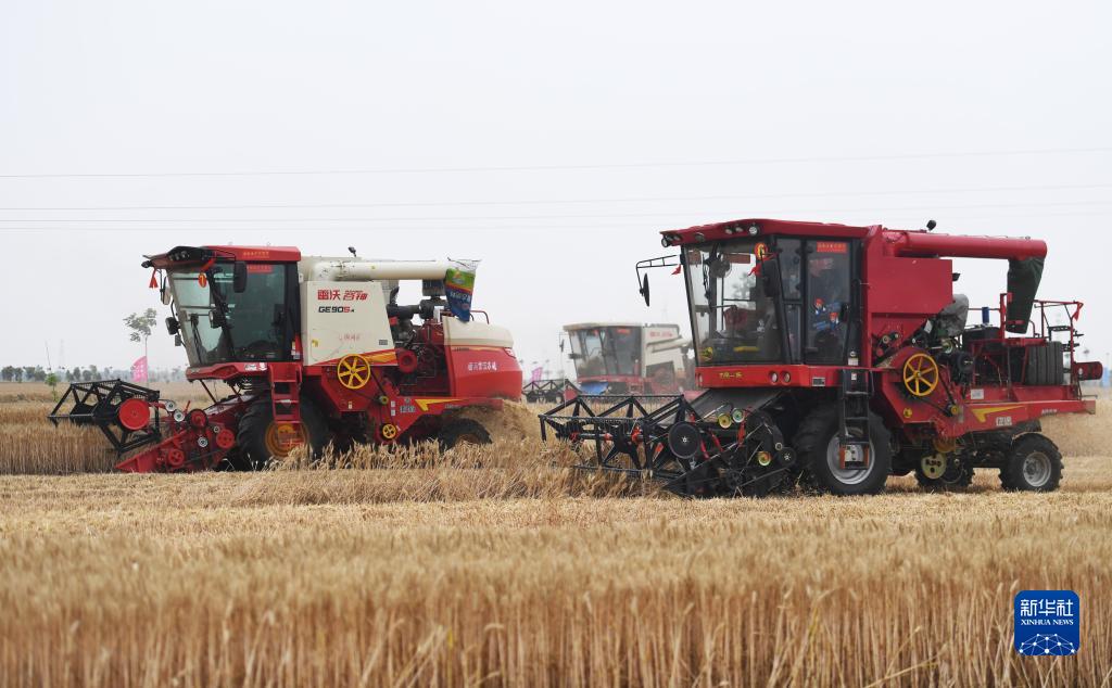 這是5月26日在河南省南陽市唐河縣湖陽鎮(zhèn)張灣村拍攝的小麥機收減損技能大比武現(xiàn)場。新華社記者 張浩然 攝