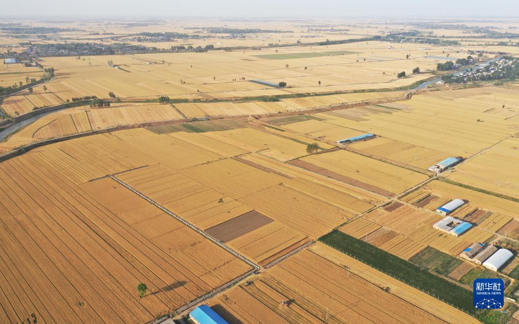 6月7日,在山東省惠民縣桑落墅鎮(zhèn),農(nóng)民駕駛農(nóng)機收獲小麥(無人機照片)。新華社記者 郭緒雷 攝