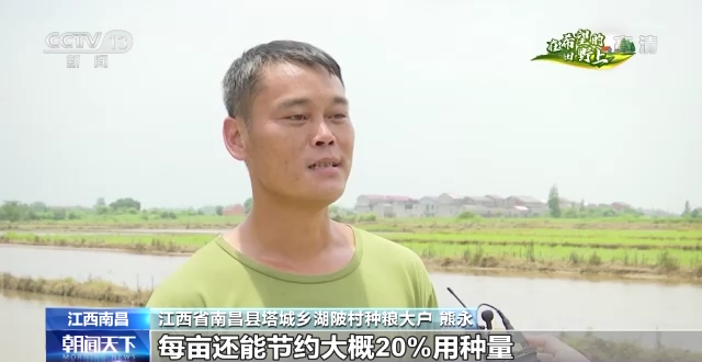江西省南昌縣塔城鄉(xiāng)湖陂村種糧大戶 熊永:種子撒得均勻,每畝還能節(jié)約大概20%用種量,人工播種的話每天只能完成30畝地左右,使用無人機(jī)一天可以完成400多畝的播種,效率是人工工作的十倍。