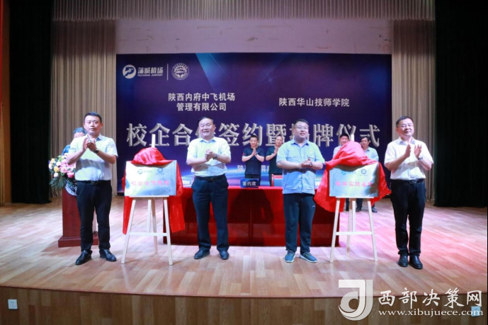 陜西內(nèi)府中飛機(jī)場(chǎng)管理有限公司董事長(zhǎng)許孟晉、總經(jīng)理魏新科與華山國(guó)際教育集團(tuán)董事長(zhǎng)任永敏、總裁張濤共同為“技能人才培養(yǎng)基地”揭牌。