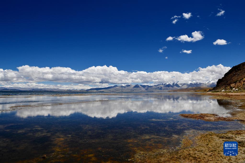 藍(lán)天白云下的瑪旁雍錯(cuò)(8月2日攝)。新華社記者 張汝鋒 攝