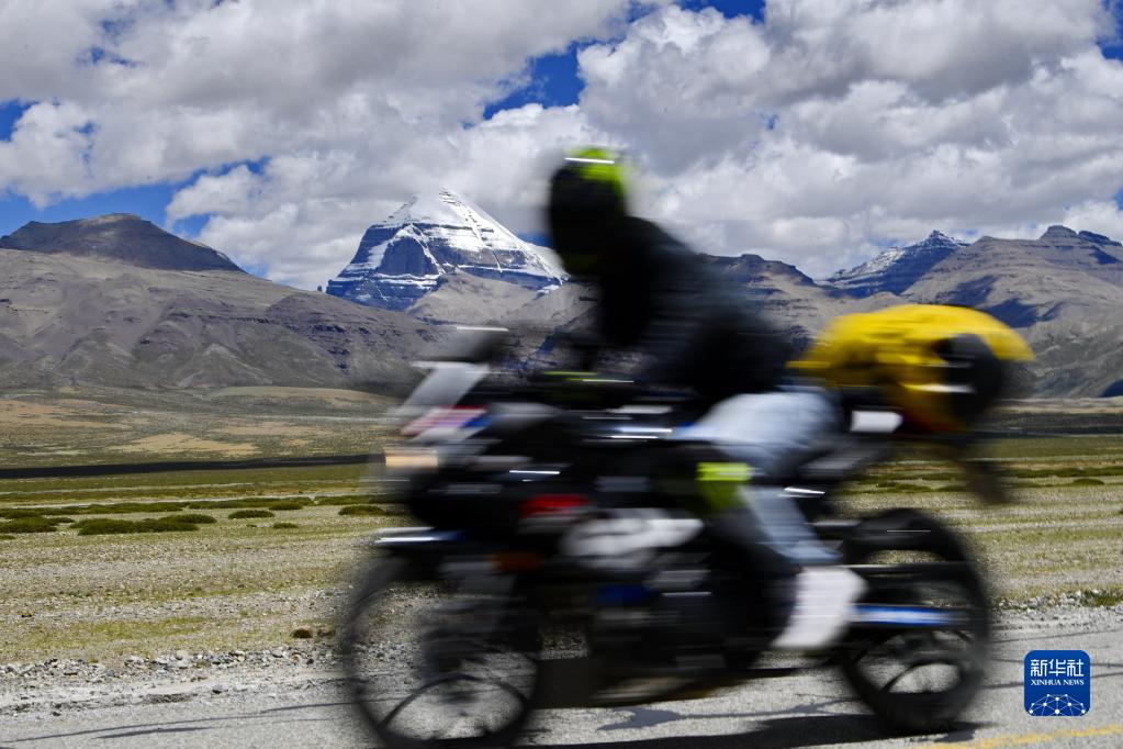 騎手駕駛摩托車經(jīng)過(guò)岡仁波齊景區(qū)(8月2日攝)。新華社記者 張汝鋒 攝