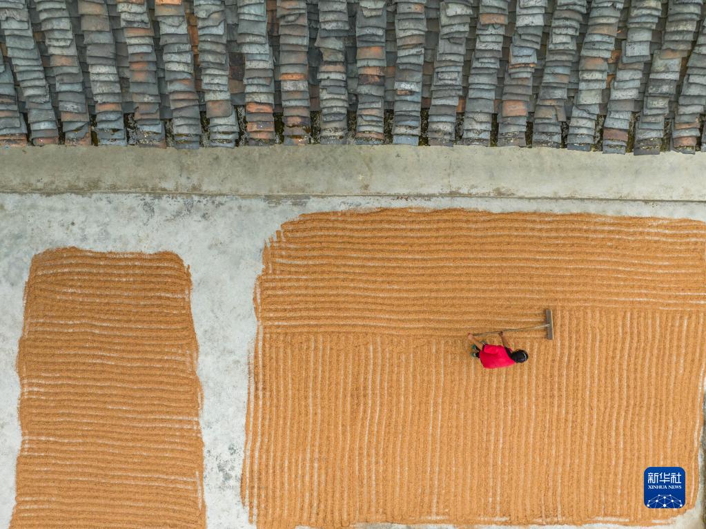 9月1日,貴州省黔西市中建鄉(xiāng)中廣村村民在晾曬糧食(無(wú)人機(jī)照片)。新華社發(fā)(羅大富 攝)