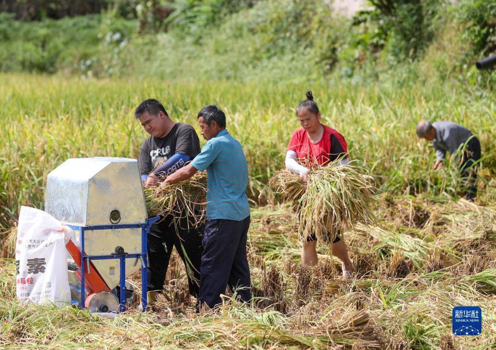 9月1日,在貴州省銅仁市玉屏侗族自治縣新店鎮(zhèn)新店村,村民在收獲水稻。新華社發(fā)(胡攀學(xué) 攝)