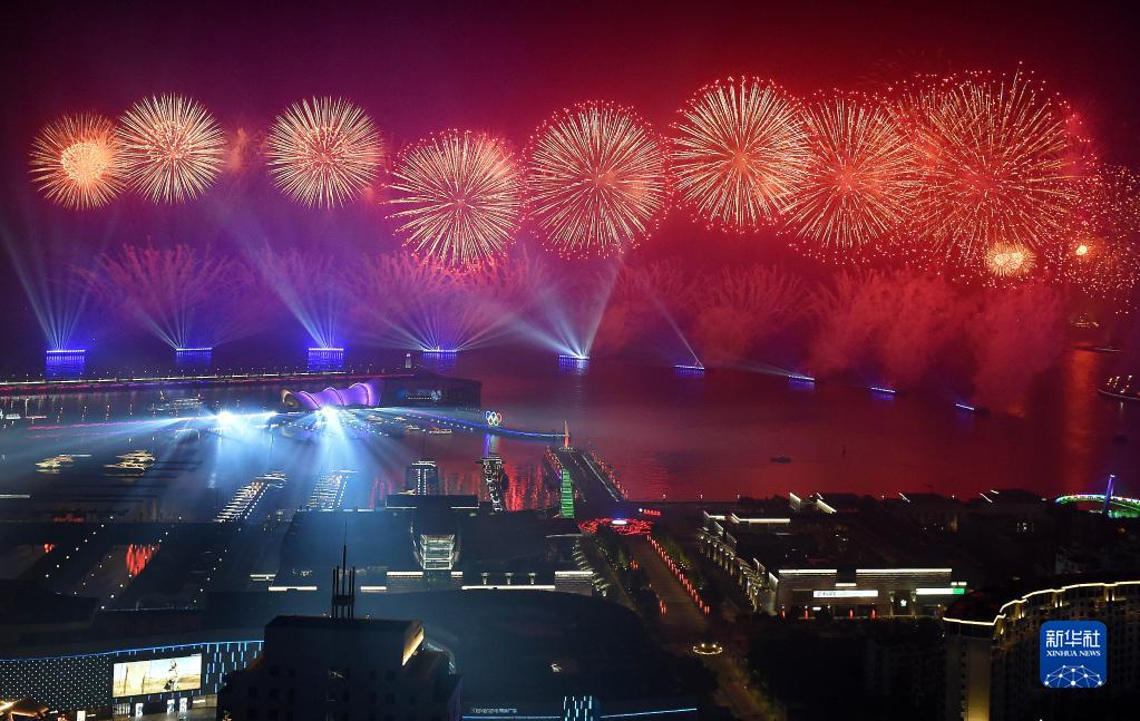 這是在青島舉行的《有朋自遠(yuǎn)方來》燈光焰火藝術(shù)表演(2018年6月9日晚攝)。2018年6月9日至10日,上海合作組織成員國元首理事會第十八次會議在青島召開。新華社記者 李紫恒 攝