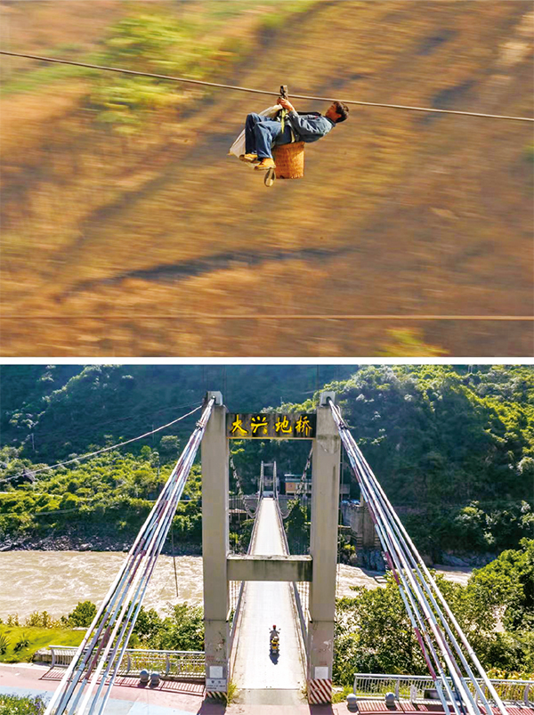 “過江靠溜索”曾是怒江兩岸群眾出行的重要方式。2013年,國家實施“溜索改橋”項目,幫助西部邊遠(yuǎn)山區(qū)群眾結(jié)束溜索時代,怒江州怒江段上溜索被改造為各式跨江橋梁,完成了沿江人民“天塹變通途”的企盼。上圖為2013年2月2日,在云南省怒江州瀘水市六庫街道,一名居民背著背簍溜索過江(新華社記者 王長山/攝)。下圖為2022年9月13日,瀘水市居民騎摩托車通過大興地橋(無人機(jī)照片,新華社記者 江文耀/攝)。