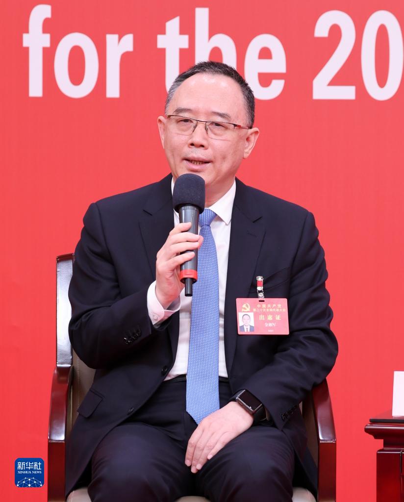 10月18日,中國共產(chǎn)黨第二十次全國代表大會(huì)新聞中心舉行集體采訪,請(qǐng)北京、天津、河北、山西、內(nèi)蒙古、遼寧、吉林代表團(tuán)新聞發(fā)言人出席,介紹代表團(tuán)學(xué)習(xí)討論二十大報(bào)告情況,并回答記者提問。這是天津市委副書記金湘軍在回答記者提問。新華社記者 張玉薇 攝