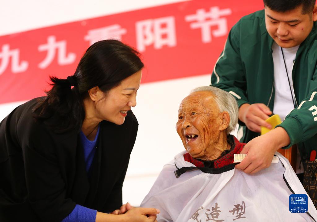 2022年10月4日,在山東省滕州市一家養(yǎng)老院,社會工作者為老人理發(fā)。新華社發(fā)(李志軍 攝)