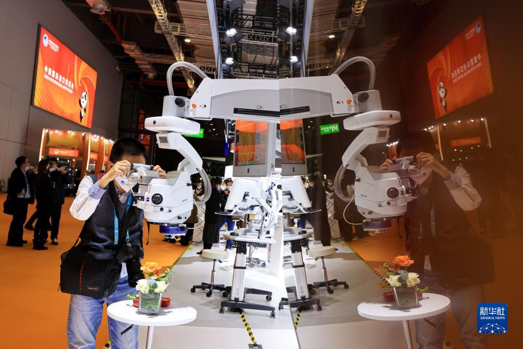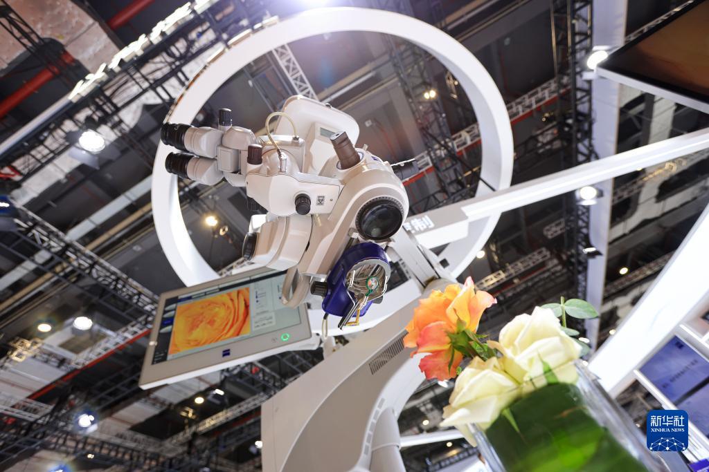 11月6日在第五屆進博會蔡司展臺拍攝的眼科導航手術(shù)顯微鏡。新華社記者 李京 攝