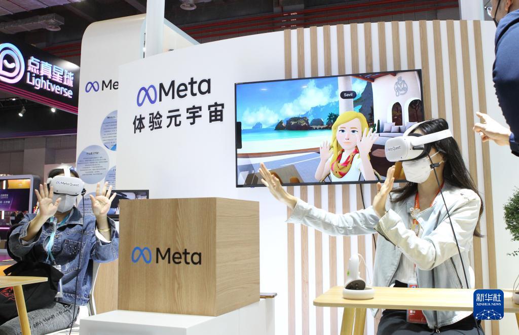 11月7日,在第五屆進博會技術(shù)裝備展區(qū)的人工智能專區(qū),體驗者借助VR頭戴設(shè)備感受在虛擬工作空間“隔空擊掌”。新華社記者 侯俊 攝