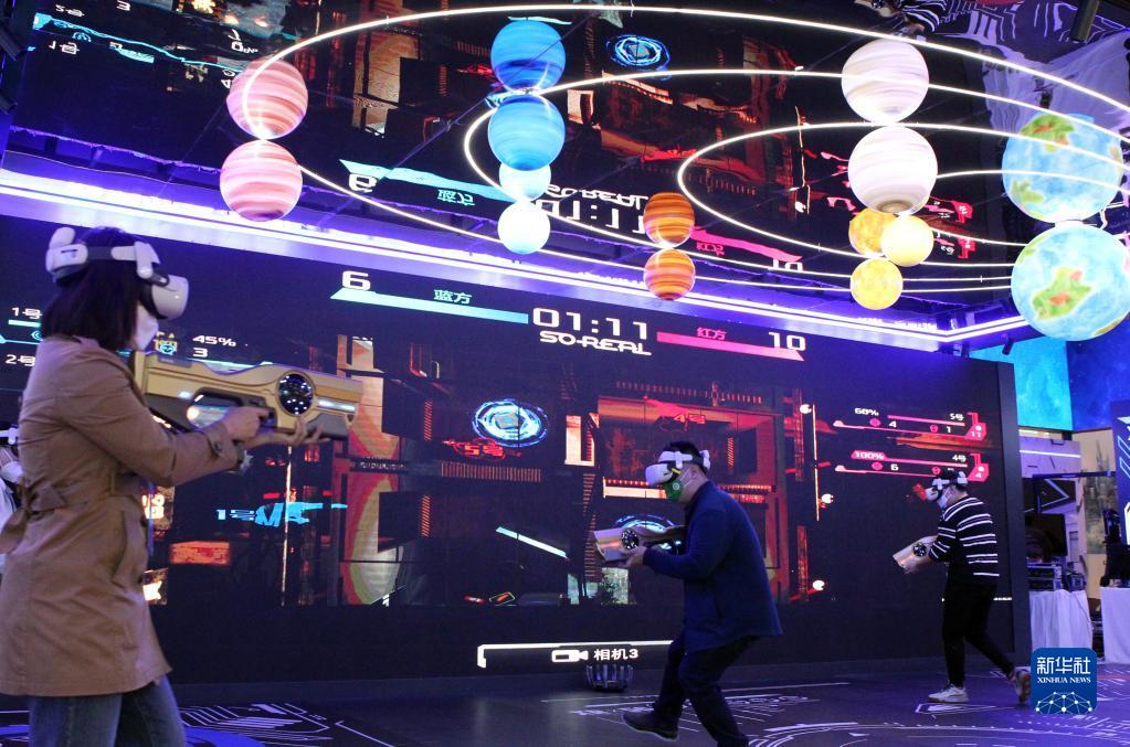 11月7日,在第五屆進博會技術(shù)裝備展區(qū)的人工智能專區(qū),體驗者借助VR設(shè)備進行電競互動游戲。新華社記者 侯俊 攝
