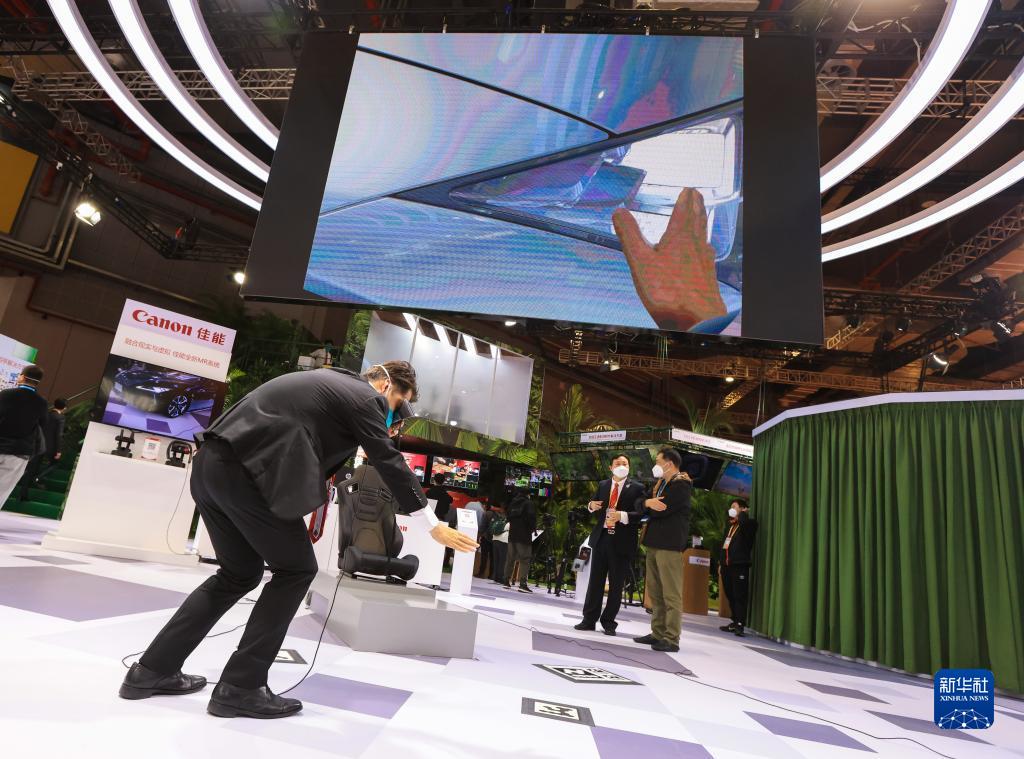11月7日,展商在第五屆進博會佳能展臺演示MR虛擬現(xiàn)實系統(tǒng)。新華社記者 李京 攝