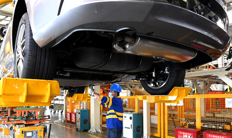 △工作人員在新能源汽車(chē)廠進(jìn)行裝配(4月20日攝)。