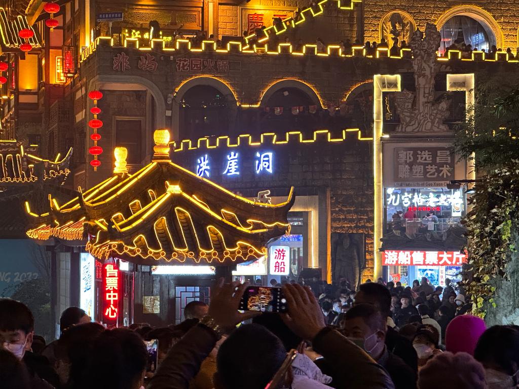重慶洪崖洞民俗風貌區(qū)重現(xiàn)歡鬧,“店鋪營業(yè)額同比增長20%。”一家火鍋店店主陳大江說;重慶老街山城巷,紅燈籠照亮青石與黛瓦,人們在打卡地排隊拍照。“這里古色古香,又融入現(xiàn)代時尚元素,很有氛圍!”游客秦藝說。