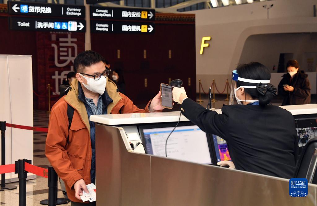 1月17日,在北京大興機場,海關(guān)關(guān)員準備核驗乘坐CZ309次北京飛往香港航班旅客的海關(guān)健康申報二維碼。新華社記者 任超 攝