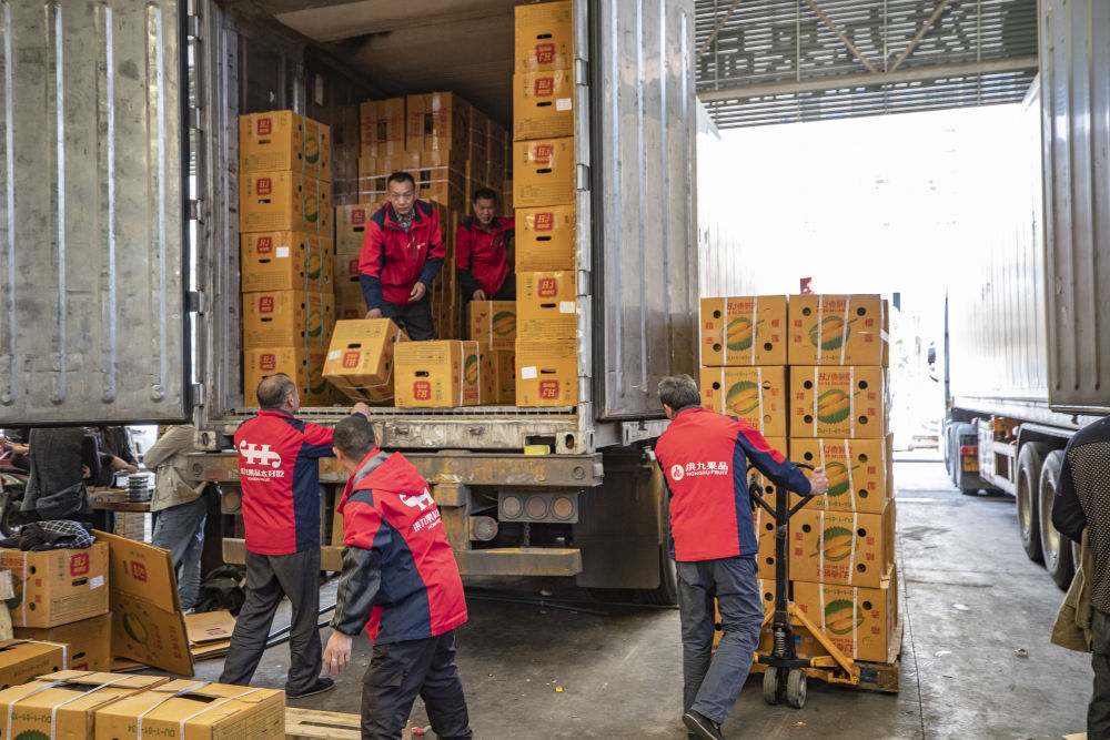 在重慶市江津區(qū)雙福農(nóng)貿(mào)城,洪九果品的工作人員在搬運從泰國運輸過來的榴蓮(2022年4月19日攝)。新華社記者 黃偉 攝