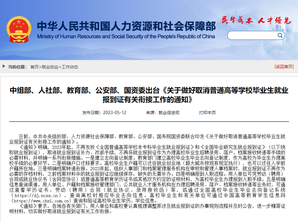 日前,中共中央組織部、人力資源社會保障部、教育部、公安部、國務院國資委聯(lián)合印發(fā)《關(guān)于做好取消普通高等學校畢業(yè)生就業(yè)報到證有關(guān)銜接工作的通知》。