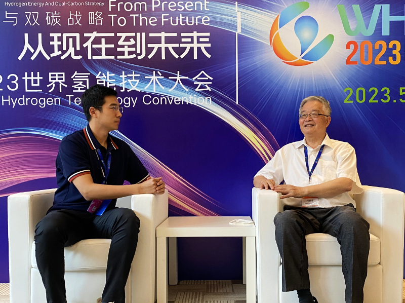 圖為國際氫能協(xié)會副主席毛宗強(qiáng)(右)接受新華網(wǎng)采訪