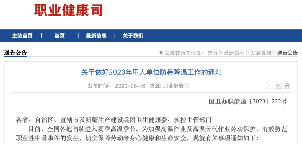 通知指出,目前,全國各地陸續(xù)進(jìn)入夏季高溫季節(jié)。近年來,夏季高溫作業(yè)及高溫天氣作業(yè)導(dǎo)致勞動者中暑死亡的事件時有發(fā)生,對勞動者身心健康和生命安全造成嚴(yán)重威脅。各級衛(wèi)生健康行政部門和疾控主管部門要進(jìn)一步明確工作責(zé)任,加強(qiáng)組織領(lǐng)導(dǎo),系統(tǒng)謀劃部署,協(xié)同推進(jìn)用人單位防暑降溫工作和各項職業(yè)病預(yù)防工作。