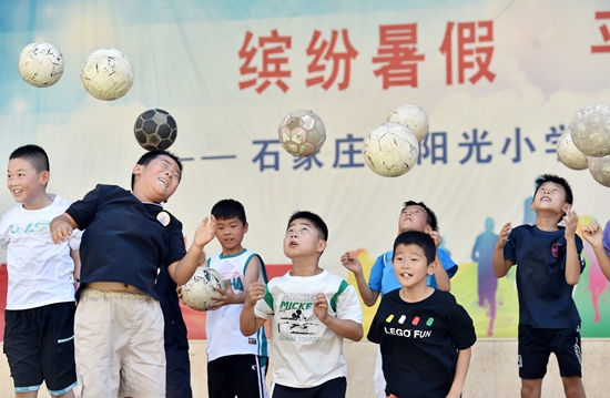 暑假期間,為減輕家長負擔(dān),有效緩解學(xué)生暑期“看護難”問題,部分學(xué)校、社區(qū)開展暑期免費托管,為學(xué)生提供作業(yè)輔導(dǎo)和素質(zhì)課程等服務(wù),讓孩子們度過一個快樂、有意義的假期。 圖為7月10日,在石家莊市陽光小學(xué),學(xué)生進行足球訓(xùn)練。張曉峰/攝(新華社發(fā))