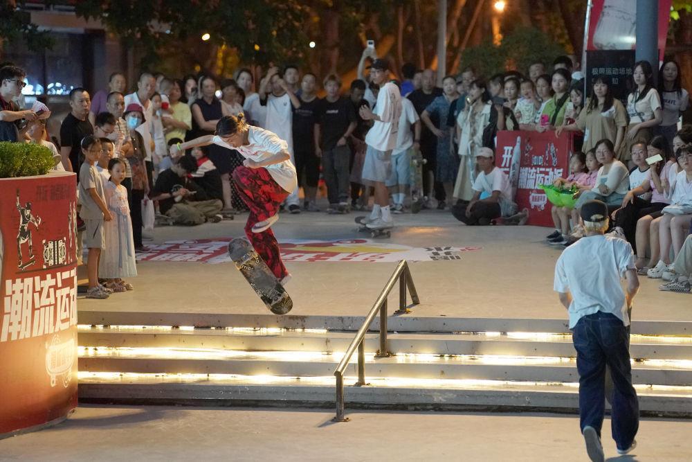 7月30日,滑板愛好者在西安市一商業(yè)街區(qū)進(jìn)行滑板表演有獎(jiǎng)競賽活動(dòng)。新華社記者 邵瑞 攝