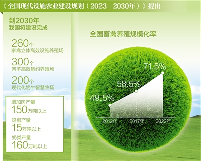 規(guī)?;O(shè)施化養(yǎng)殖助推畜牧業(yè)綜合產(chǎn)能提升?!度珖?guó)現(xiàn)代設(shè)施農(nóng)業(yè)建設(shè)規(guī)劃(2023—2030年)》(以下簡(jiǎn)稱《規(guī)劃》)提出,到2030年建設(shè)完成260個(gè)家禽立體高效設(shè)施養(yǎng)殖場(chǎng)、200個(gè)肉牛高效集約養(yǎng)殖場(chǎng)、300個(gè)肉羊高效集約養(yǎng)殖場(chǎng)和200個(gè)現(xiàn)代化奶牛智慧牧場(chǎng),增加肉產(chǎn)量150萬(wàn)噸以上、雞蛋產(chǎn)量15萬(wàn)噸以上、奶類產(chǎn)量160萬(wàn)噸以上,我國(guó)的肉蛋奶供應(yīng)保障水平將進(jìn)一步提高。